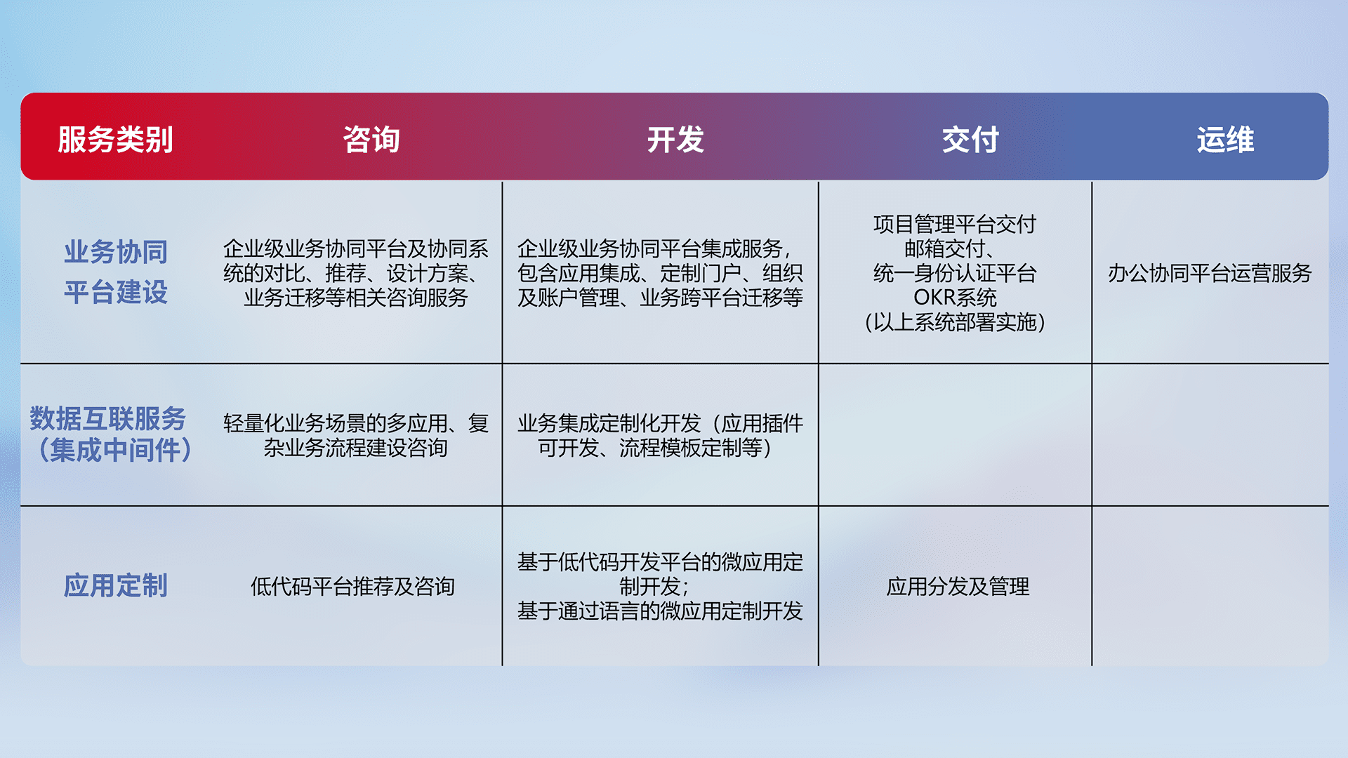 针对钉钉、、、企微、、、、IDaas等平台级产品提供产品的规划、、、方案、、、、交付、、定制化开发等服务,,实现如统一协同办公、、智能客户服务、、混合会议管理、、、智能数据查询、、等业务场景,,,实现数字化转型。。
