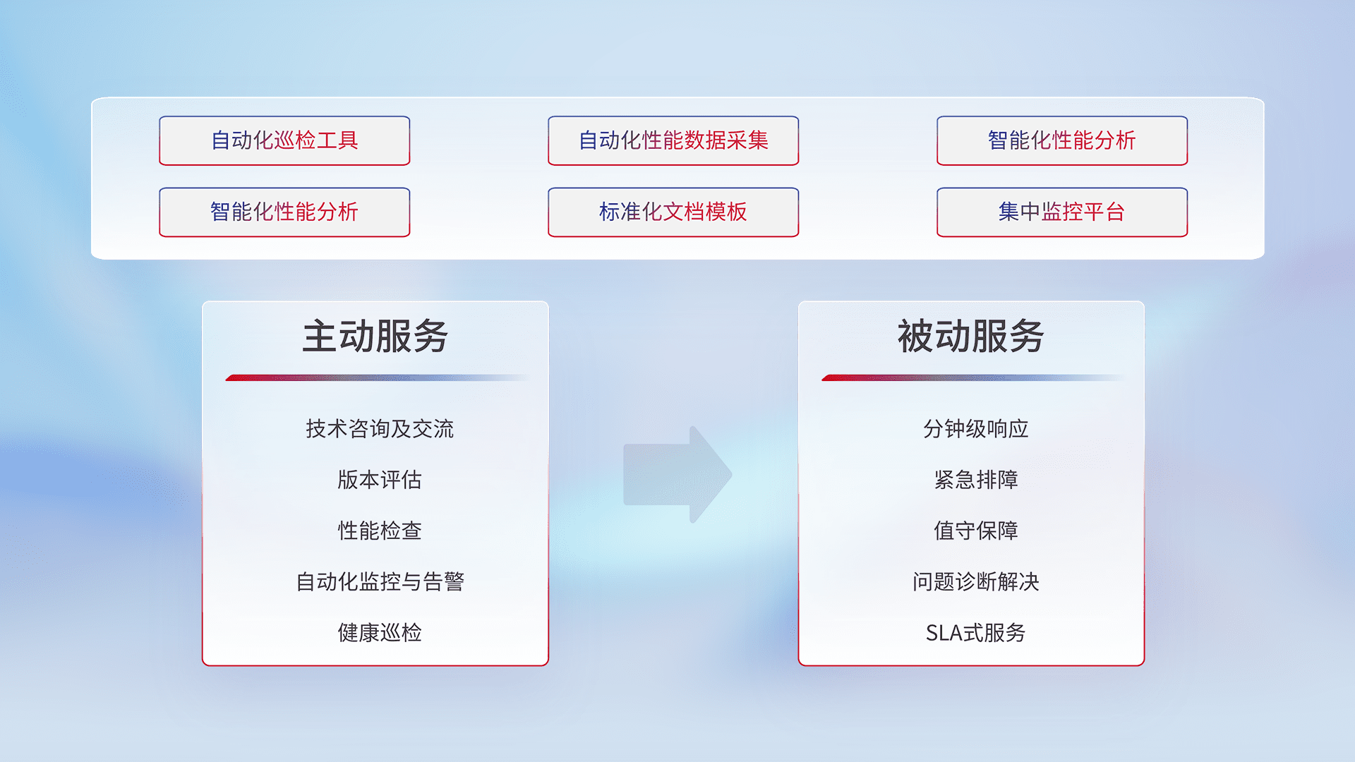 智能化工具和标准化文档,,,,保障服务质量,,提供主动服务(包含技术咨询、、、版本评估、、性能检查、、、、自动化监控与告警、、、、健康巡检)和被动服务包含(分钟级响应、、、紧急排障、、值守保障、、、、问题诊断解决、、、、SLA服务)。。。。